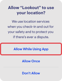 Note: If you select Don't allow, you will be prompted to enable location services next time you select a visit in the the Lookout app.