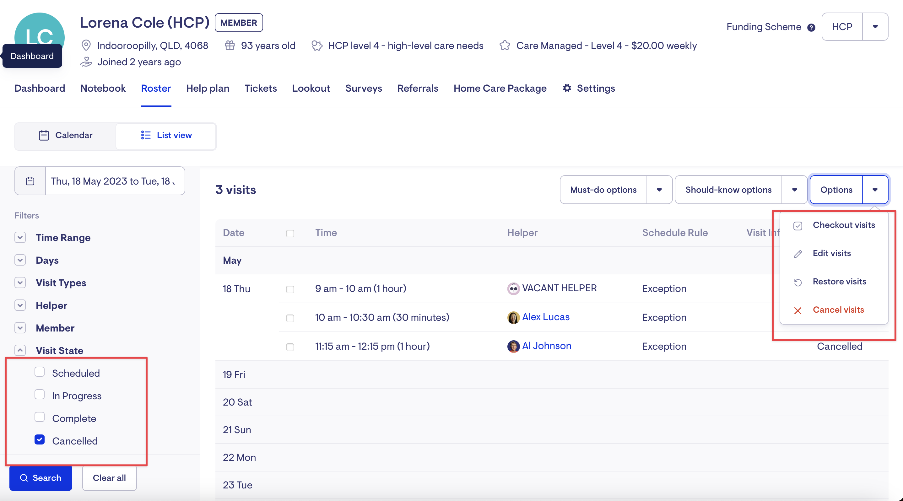 We have included a new feature that enables the restoration of cancelled visits. This functionality comes in handy when a member is on leave but returns earlier than expected, and you wish to restore the previously cancelled visits. To locate cancelled visits within a specific date range for a membership, navigate to the Roster List view and apply the appropriate filters. Once you have identified the desired visits, select them and click "Options" followed by "Restore visits".