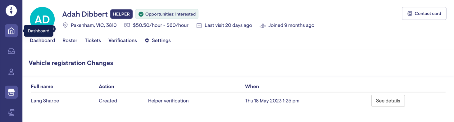 Staff granted the "Verifications" Access Role can access a change log showing any updates made to Helper verifications.