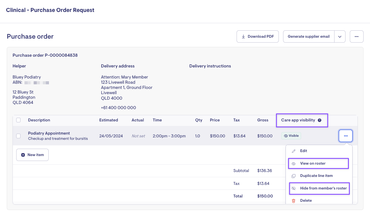 We have implemented a new feature that allows purchase order line items to be included in a member's roster and displayed within the Member's Care app for improved visibility.