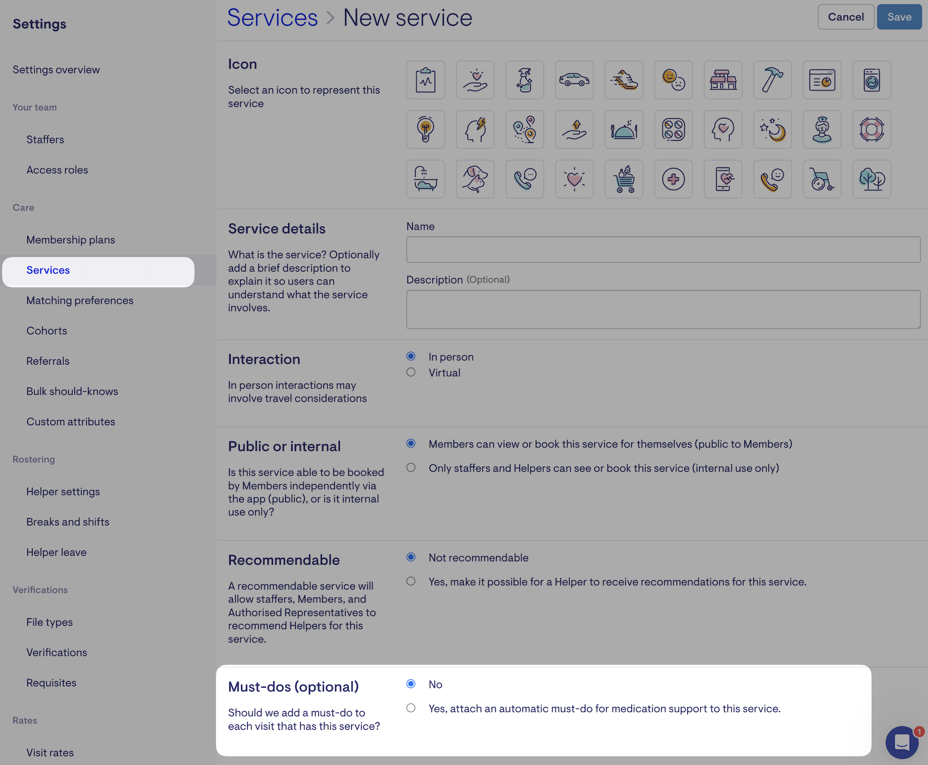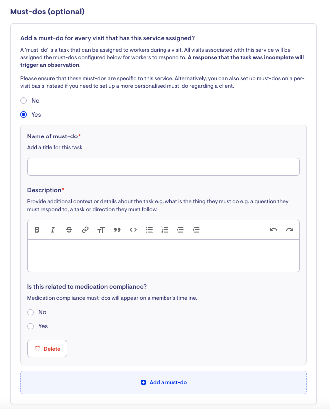 We've enhanced our must-do feature by allowing multiple automatic must-dos with customisable titles and descriptions to be added directly to services. Previously, this capability was limited to a single medication compliance must-do.