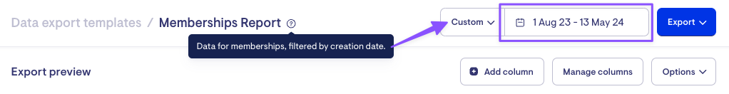 For instance, in the 'Memberships' category, data is filtered or fetched based on the 'creation date.' When you enter a date range, the Data Exporter will generate a report for memberships created during that period.