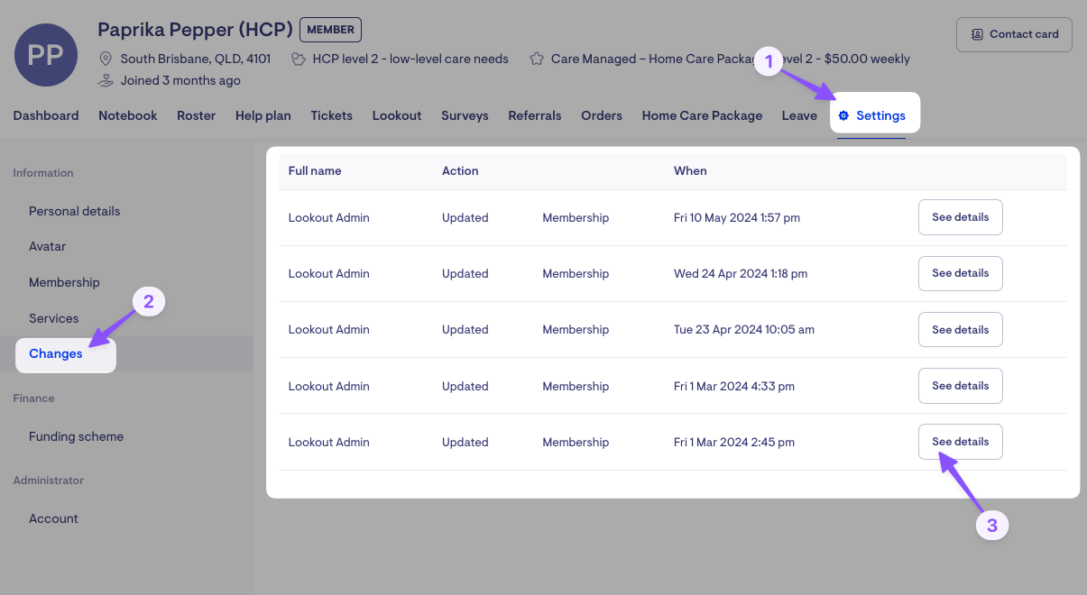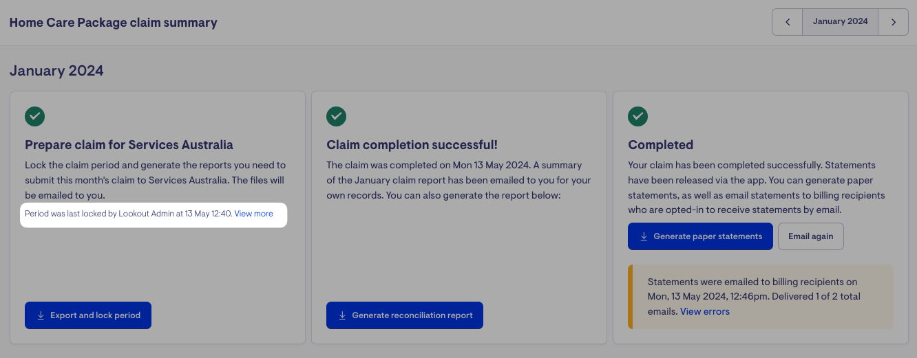 We've introduced a History auditing feature to enhance transparency in the Home Care Package claim summary. A log message will be displayed by default indicating who and when the claim period was last locked.