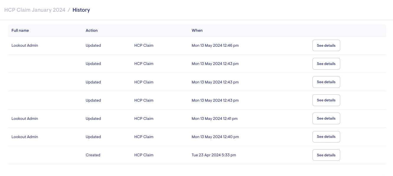 Clicking on the 'View more' link will take you to the History page, which provides detailed information on who updated the HCP claim and when. This history also captures when it was adjusted and finalised and when statements were delivered.
