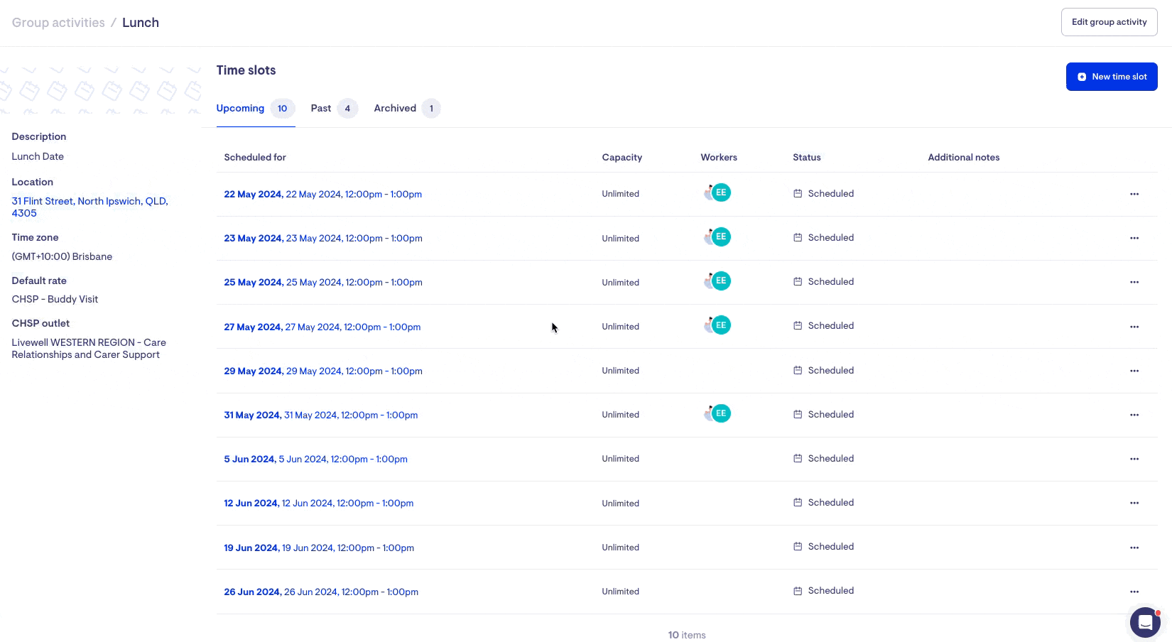 Group activities can now be archived in bulk with the 'Archive timeslot and all after' option. Archiving a group visit will also cancel the visit on the helper and member rosters.