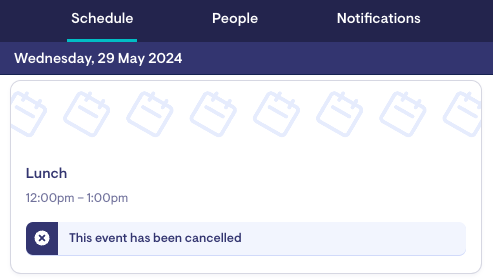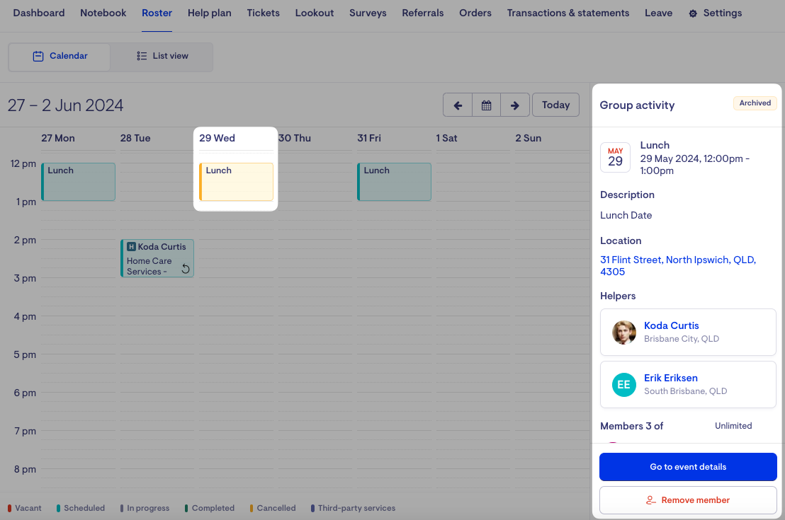 It will also appear on the member's care app as a cancelled event. However, cancelled group activities will be removed from the helper's schedule page in the Care app, similar to cancelling a standard visit. Removing the member from the group activity will delete the visit from their roster and the Care app.